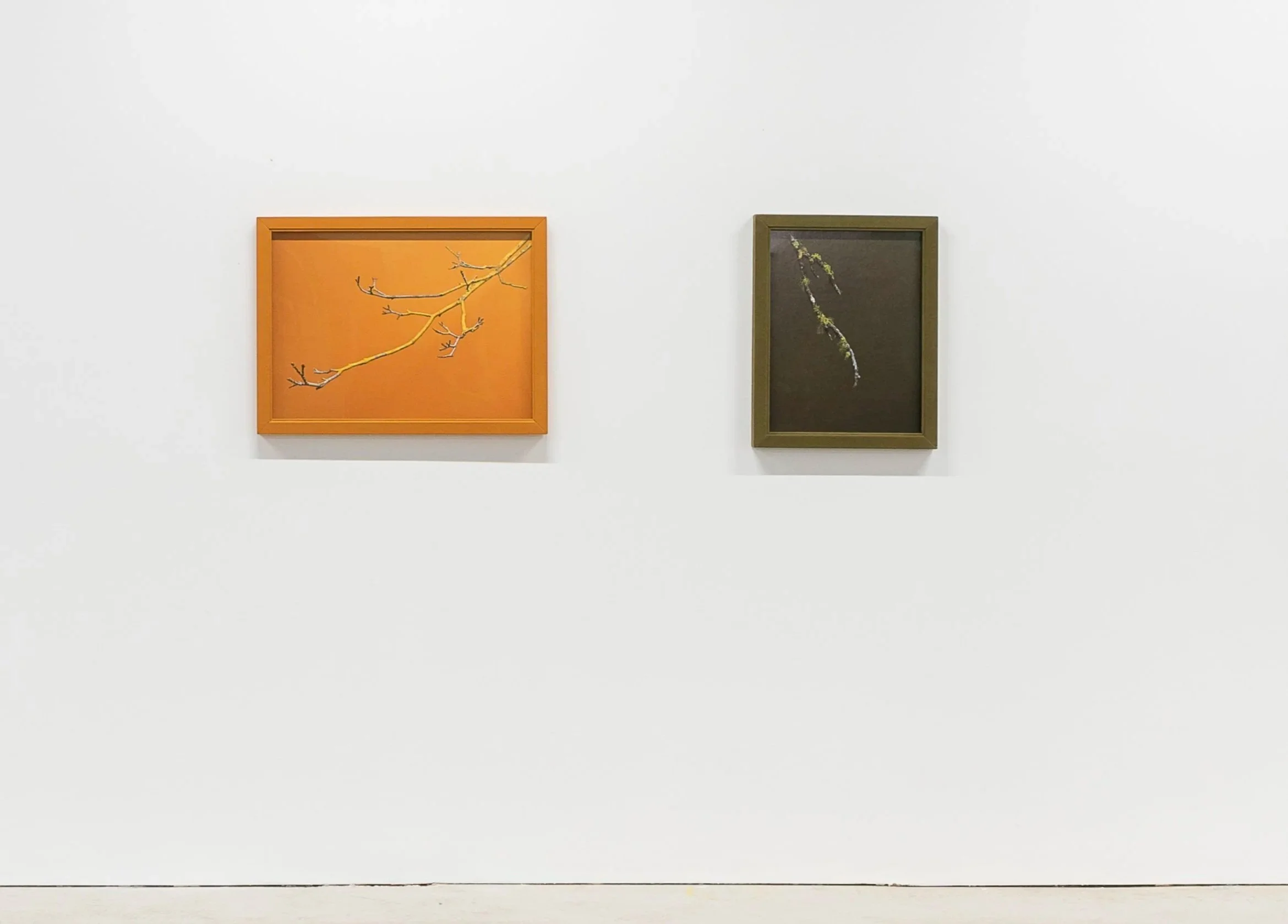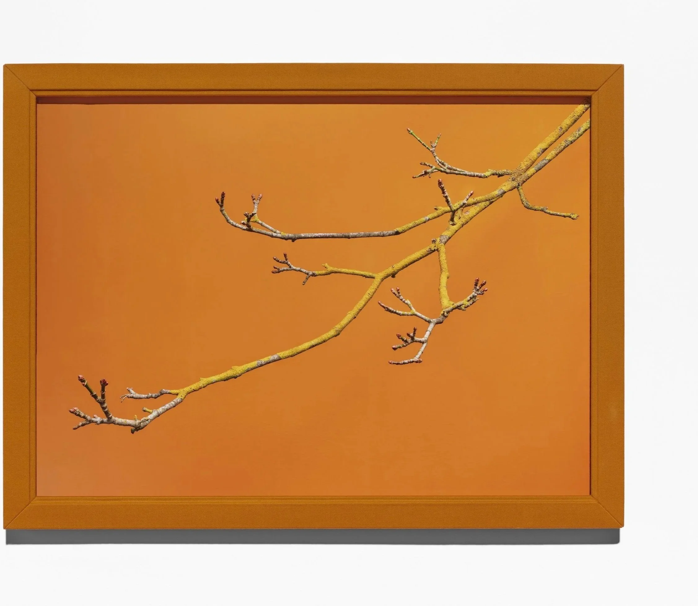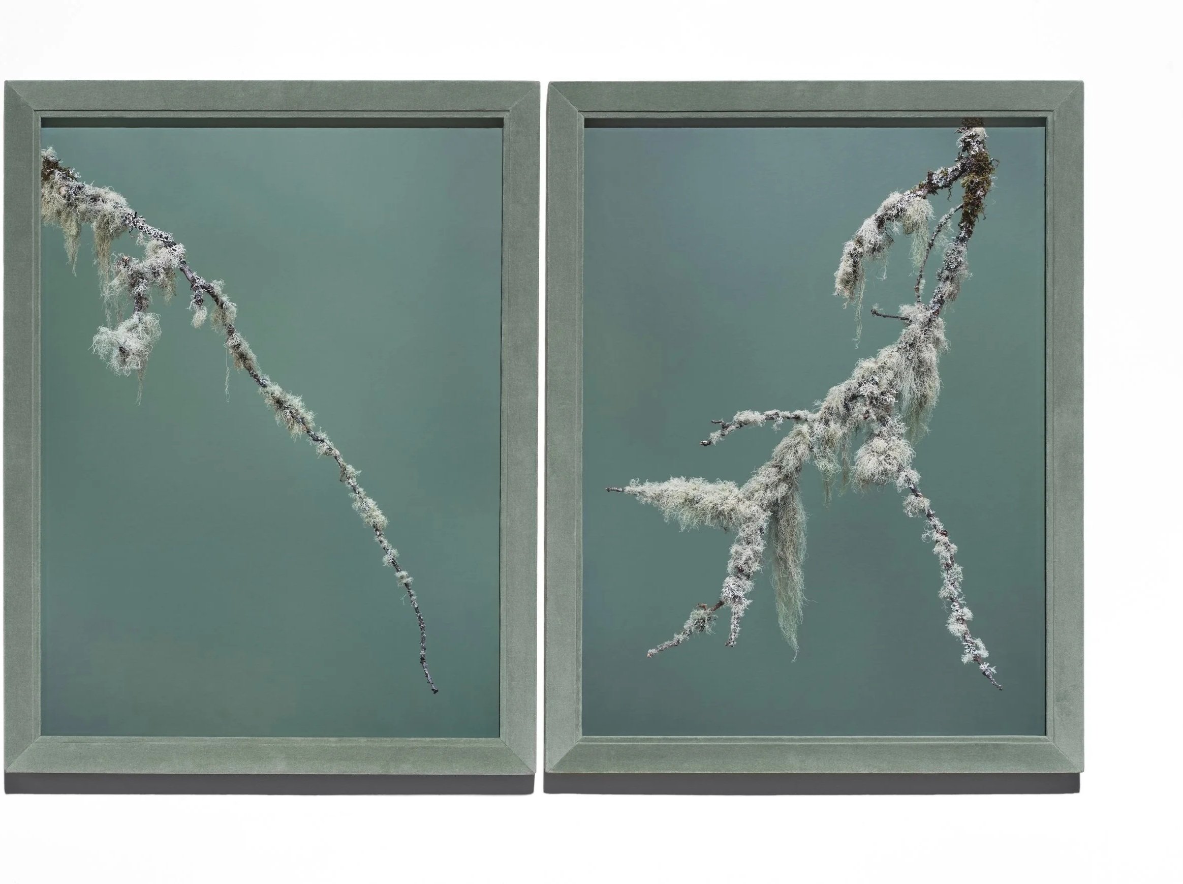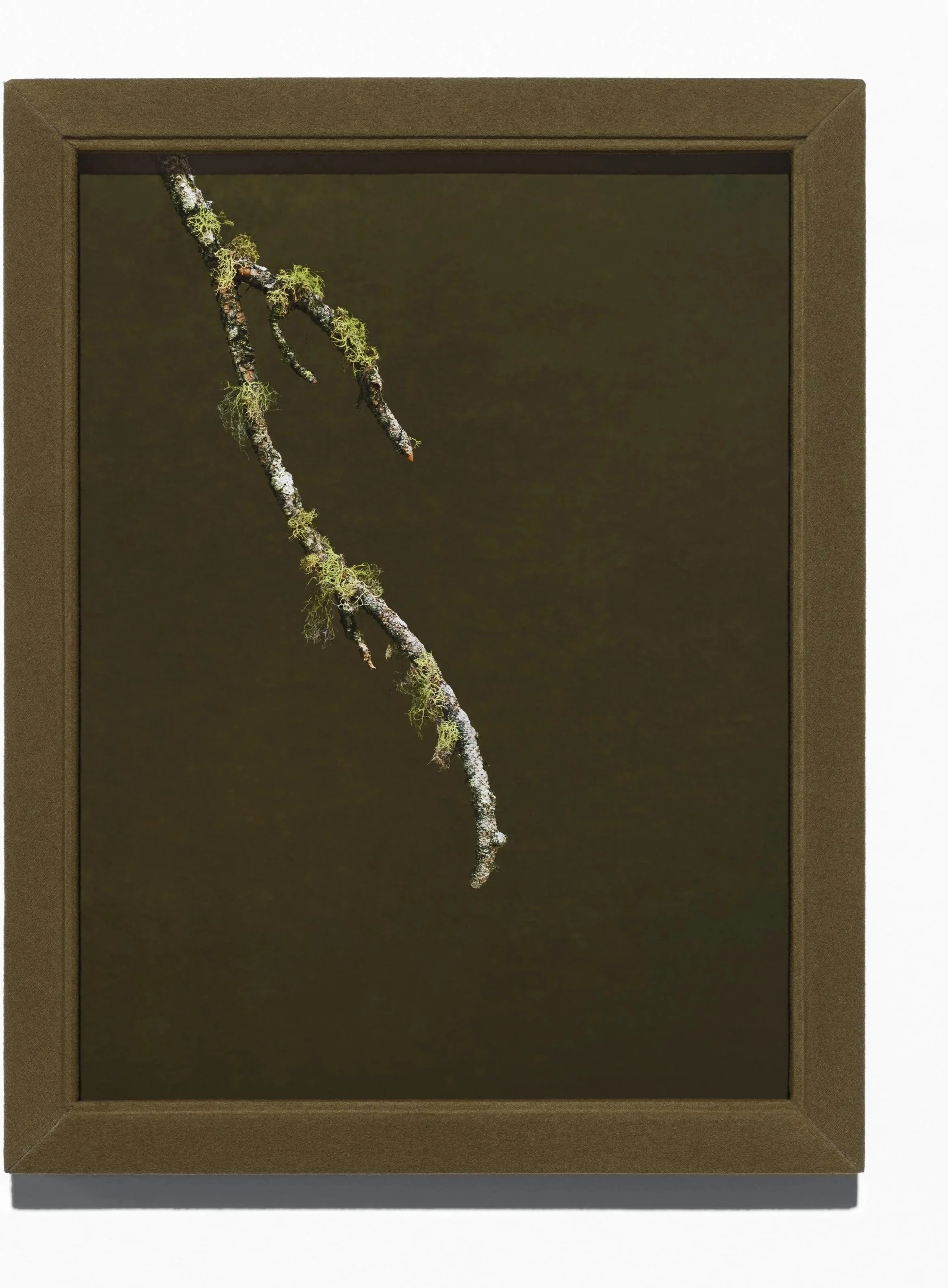Is lichen stealing nutrients and blocking light essential to the life of the host plant? While the beauty and colors are mesmerizing they can also sometimes appear repulsive. The grace and elegant lines these branches make in the studio context are affecting, and the fabric-wrapped frames reflect the tactile experience depicted by the photograph. While beauty takes front stage, an anthropomorphic quality surreptitiously occurs over time. These opportunistic living things exist in a symbiotic relationship between fungus and photosynthesis.