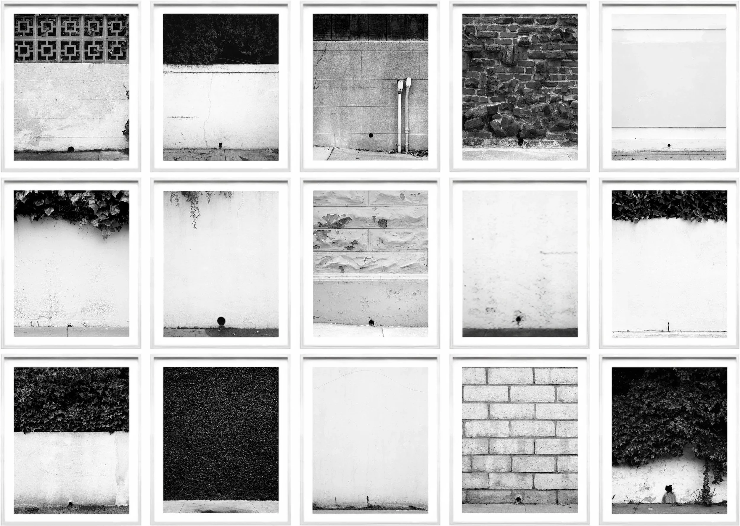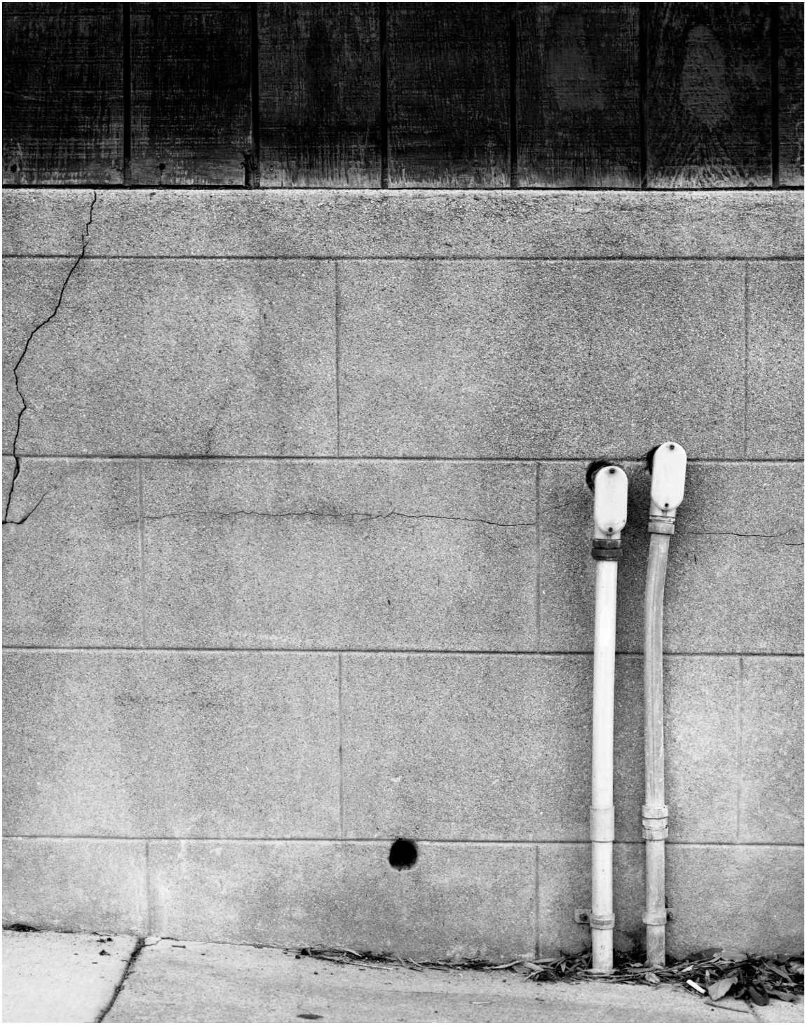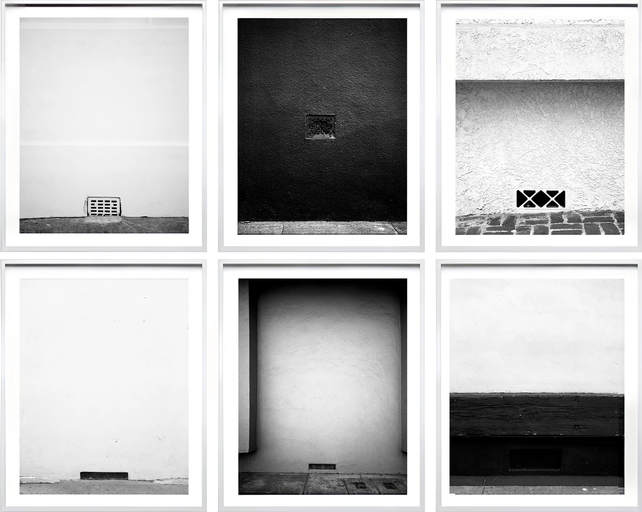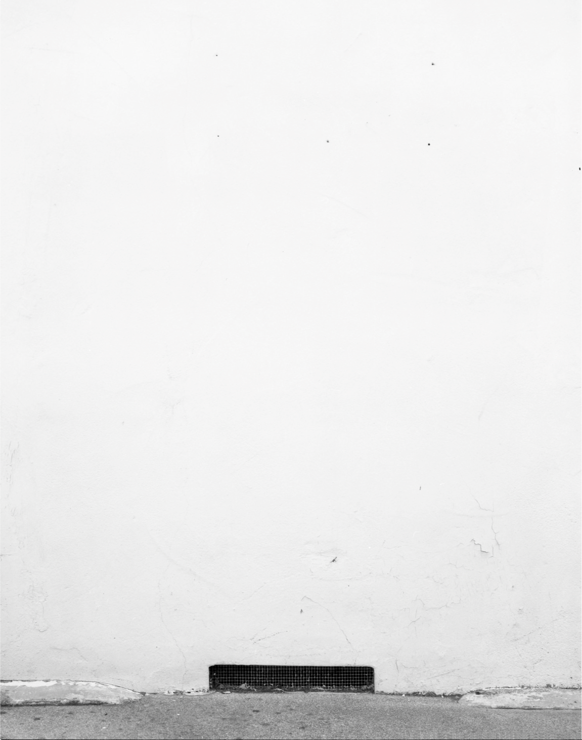 Weep Holes and Foundation Vents are architectural terms, referring to outlets allowing essential ventilation and drainage for trapped moisture. Inspired by the metaphor, I was also intrigued by the visual impact. Because these common surfaces and spaces are often camouflaged or hidden, they can easily be overlooked by passersby. These images suspend forward movement and turn the viewer to the wall—to focus on the architectural surface as it meets the ground or sidewalk. As formal abstractions the meaning unfolds gradually.