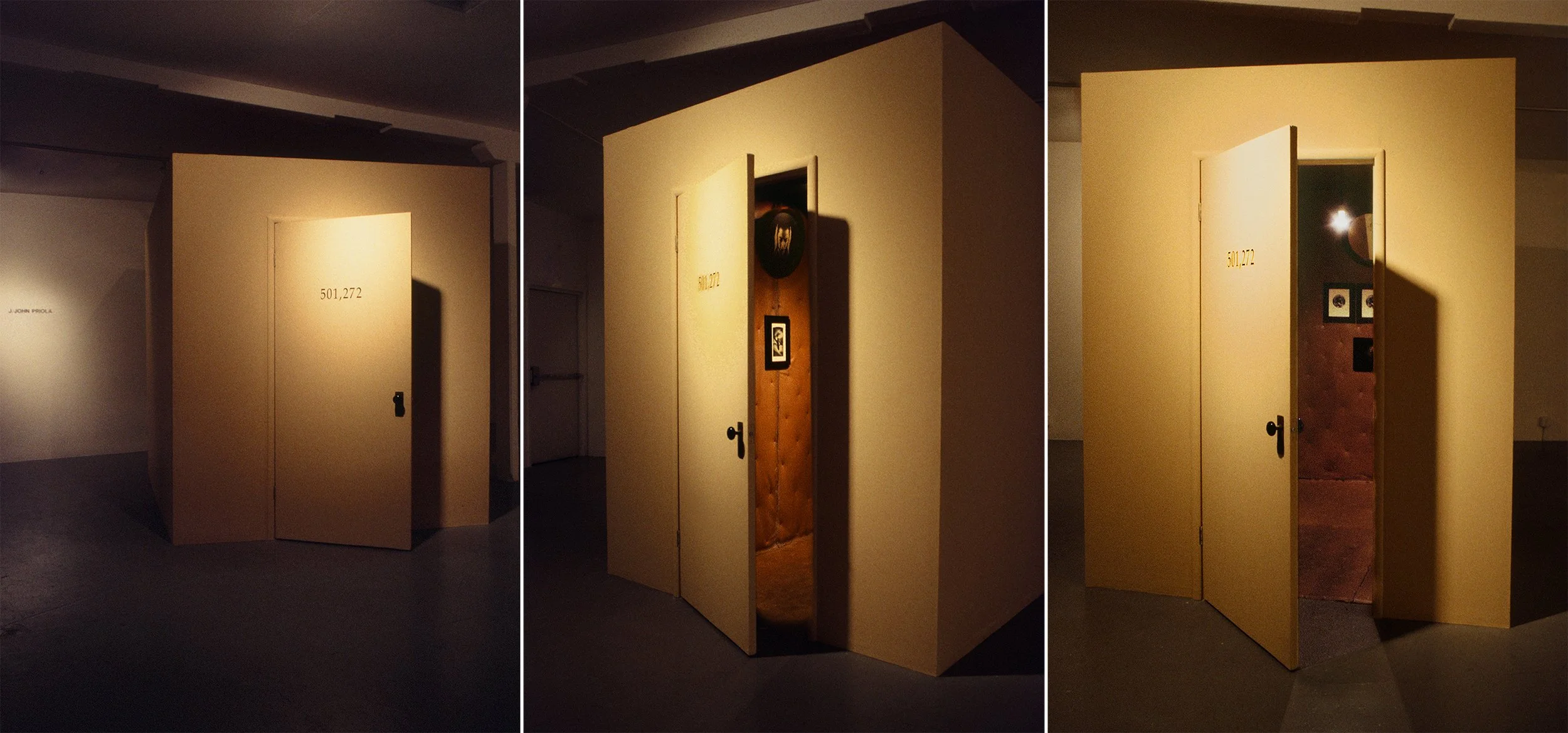 Three installation views of outside room looking in, New Langton Arts, 1992