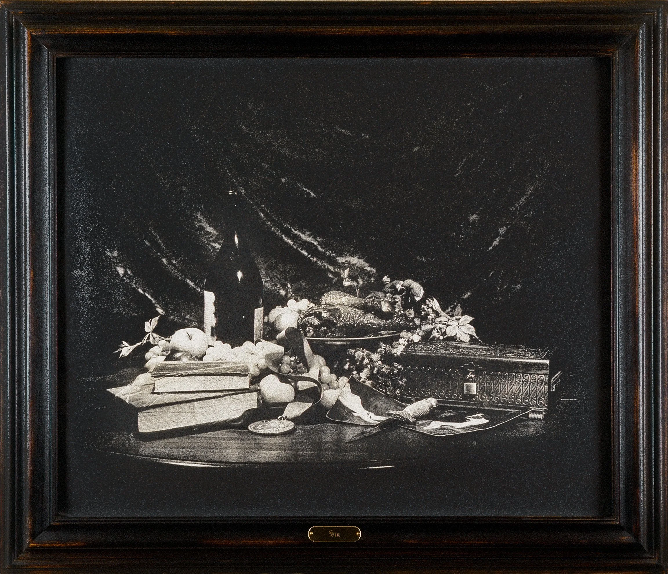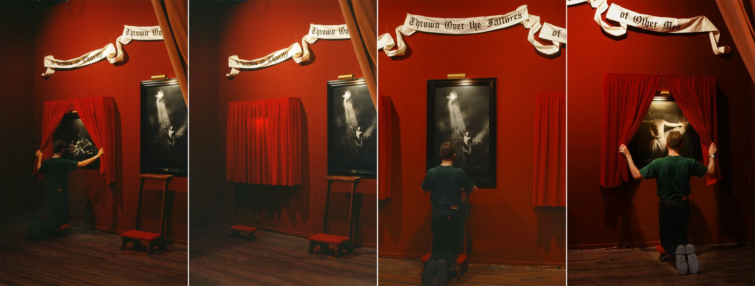 The installation surrounds the viewer with dark red walls, inviting them to kneel in order to view two of the three images. The two images veiled are Guilt (after Fragonard)’ and Sin (an allegorical still life of the Seven Deadly Sins) and Judgment is always visible and therefore not veiled. The title is taken from Catholsim scripture and speaks to the religious dogma that leads many people to behave a certain way.
