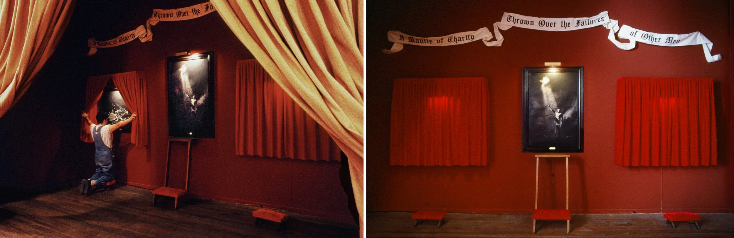 Description of Installation: Three large-scale gelatin-silver prints, framed, lit by painting lights, kneelers, curtains, and dark red walls